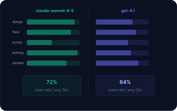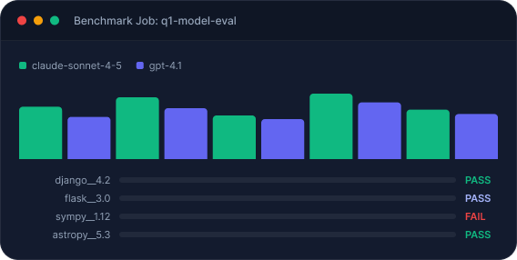 Access established benchmarks like SWE-Bench Verified directly through the platform. Results are private to your organization, not submitted to a public leaderboard.