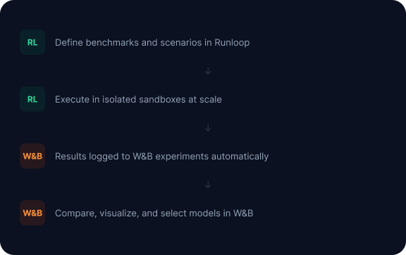Runloop runs your agent benchmarks. Weights & Biases tracks every metric, artifact, and experiment across runs. Together: a single workflow from benchmark execution to model selection.