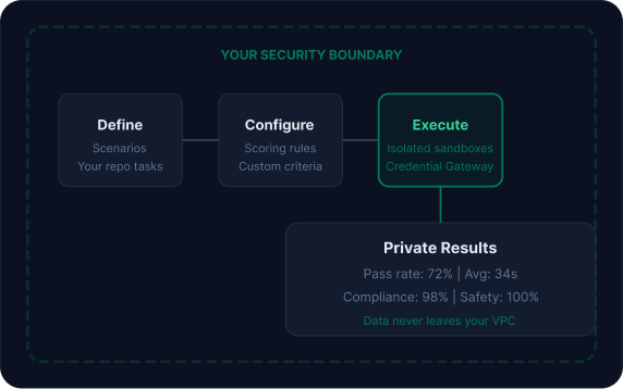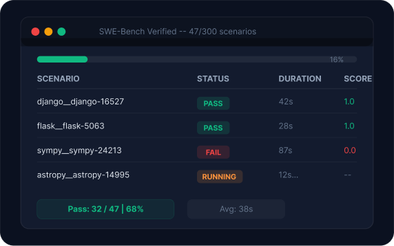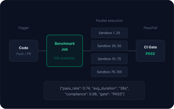 Run public benchmarks, build private evaluation suites, and integrate regression testing into your CI/CD pipeline -- all on infrastructure purpose-built for agent execution.