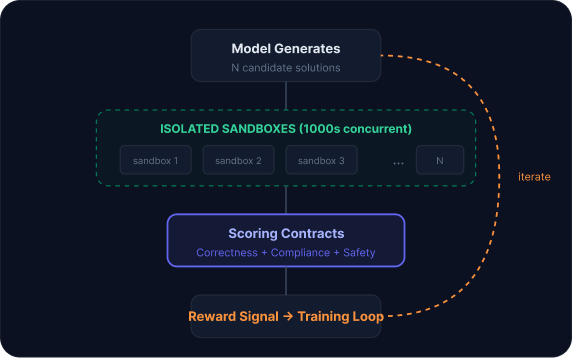 Fine-tuning workloads use Runloop's sandbox infrastructure as the execution substrate for training loops. Scoring contracts encode correctness, compliance, safety, and business logic into the reward signal.